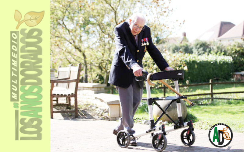 A pesar de necesitar un andador para caminar (foto), éste ex capitán de la Segunda Guerra Mundial lanzó en abril del pasado año el desafío de recorrer 100 veces los 25 metros de su jardín antes de cumplir los 100 años, con la finalidad de recaudar 1000 libras esterlinas en donaciones, para apoyar a asociaciones vinculadas al servicio público de salud (NHS).