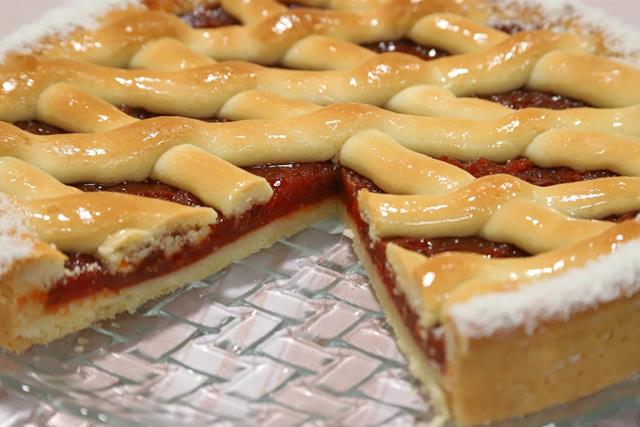 Se estira la otra parte de la masa y se cortan tiras, con las que se cubre el dulce, entrecruzándolas. Se dobla el borde de la masa hacia adentro. Se lleva a horno muy caliente durante 20 minutos. Desmoldar fría.