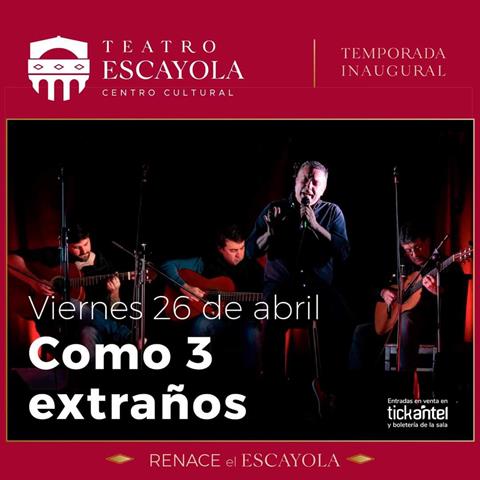 La Intendencia de Tacuarembó comunica que comienza la temporada inaugural del Centro Cultural Teatro Escayola. Se anuncia para este viernes 26 de abril a la hora 20, el espectáculo “Como 3 extraños” con Gastón Ríos en voz, acompañado por las guitarras de Bernardo Sanguinetti, Carlín Levratto y Marcelo Santamarina. Una cita con el tango, la milonga, el candombe y el vals. Las entradas están en venta a través de Tickantel.